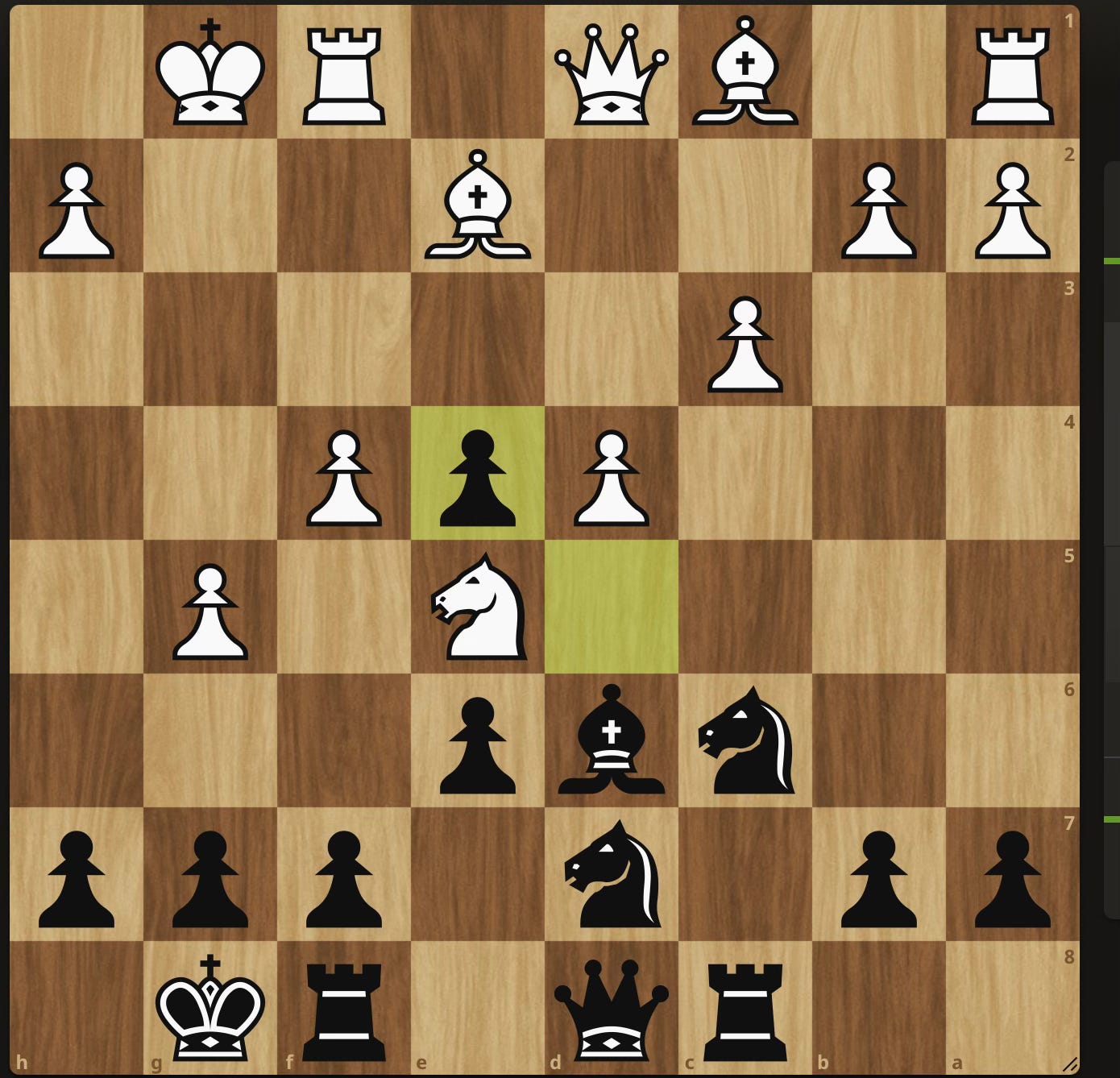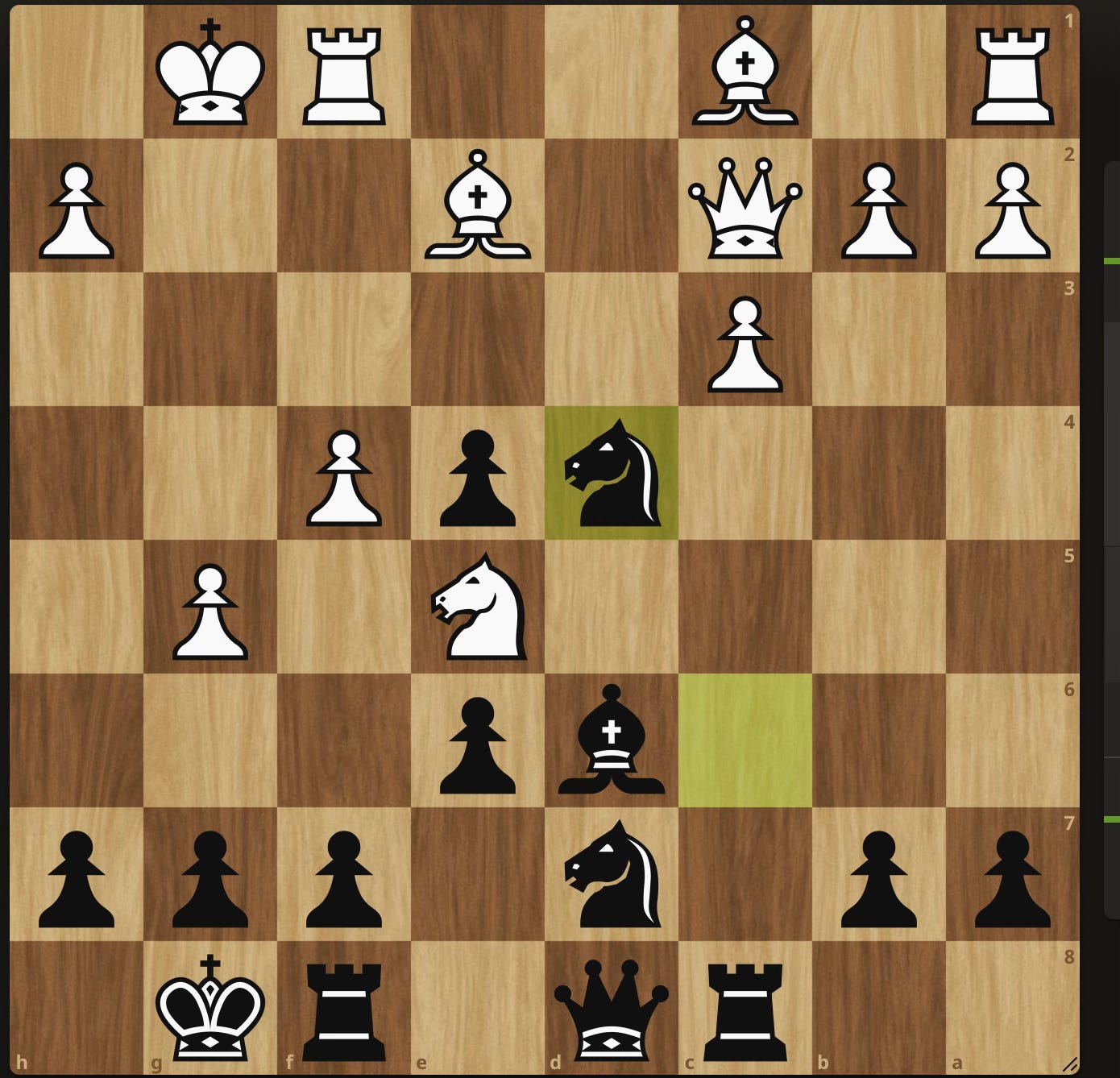 Black is better thanks to the pressure on the Queenside and c5 is coming to break up the center. I was prepped for this line… only to not get it! Instead my opponent went for the London and I played my response from memory. Only I made a series of inaccuracies that led to a fateful mistake. Black to play and keep it equal.