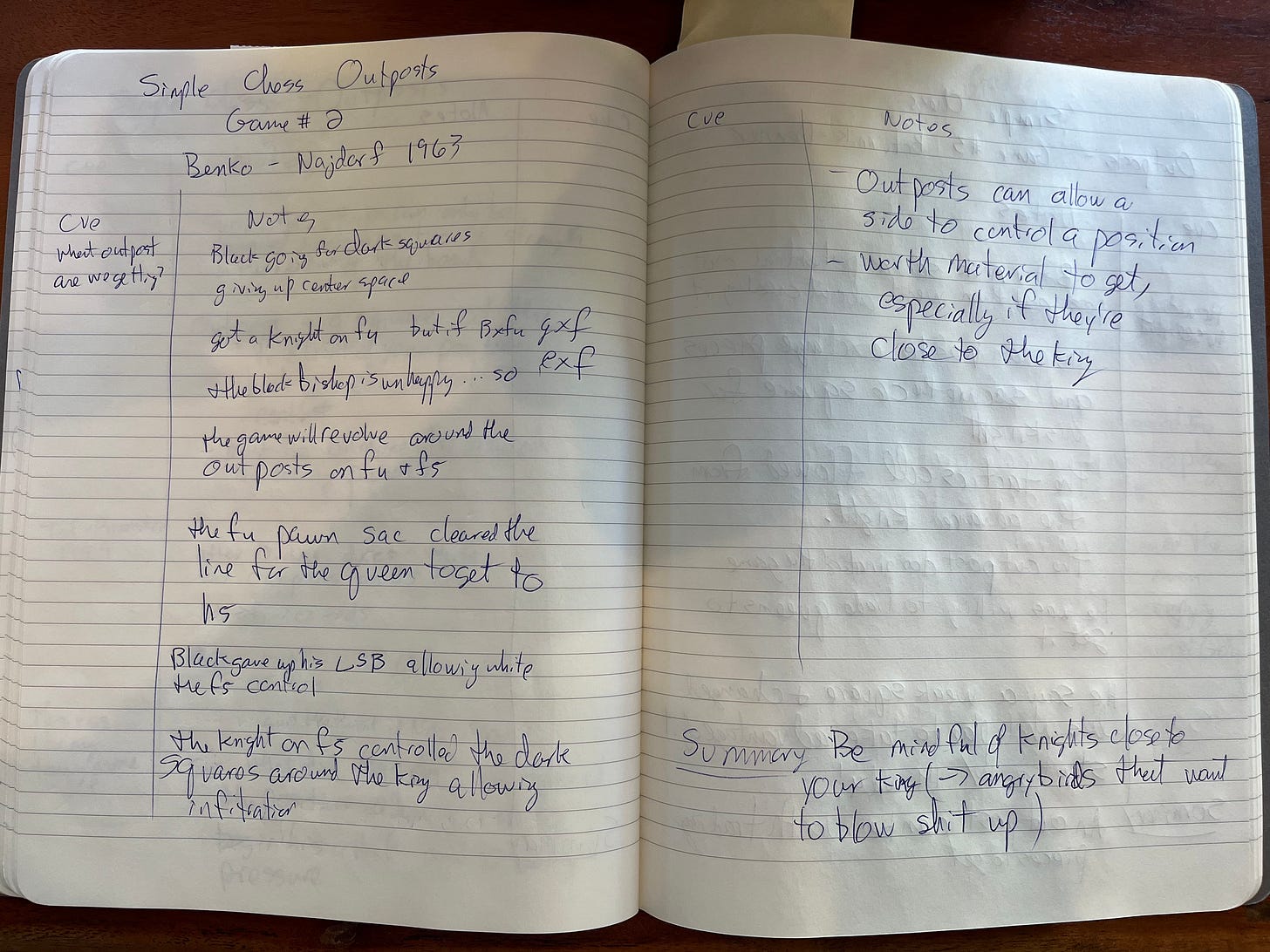 While you're at it, take notes. What would you play differently? Try your best to answer the question, even if you’re dead wrong it still helps learning. Only then, after you’ve tried to solve it on your own, can you look up the answer in your opening resource. This method of trying to get the answer before you’re shown how to do something is another key strategy for retaining information better. You don’t have to be right, you just have to be invested in the answer. Also feel free to make a flashcard from positions that give you a hard time. This whole session can be done 20-30 minutes.