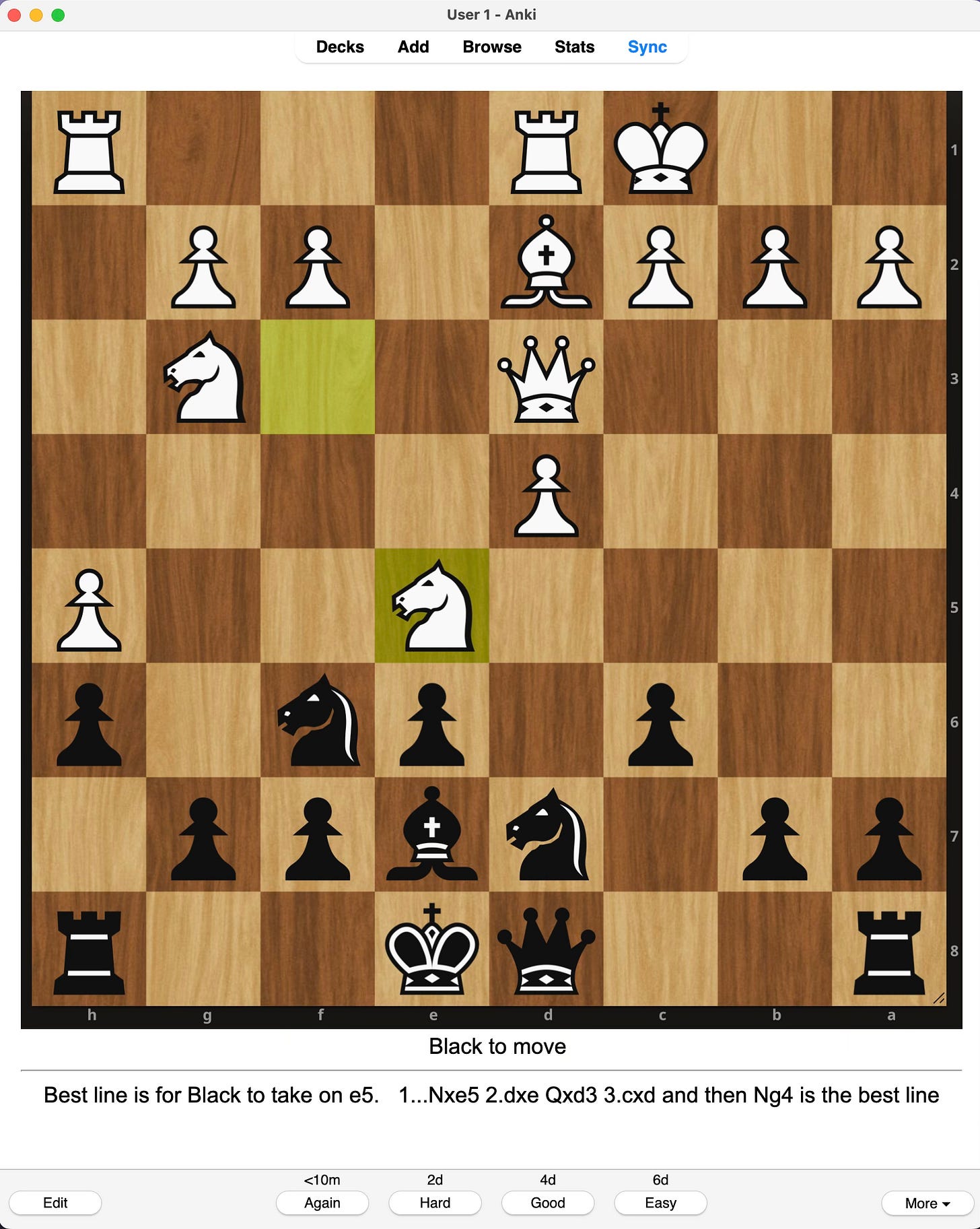 If you’re not familiar with Anki flashcards, please take a minute to read Dan Bock’s post on using flashcards to improve at chess. To summarize, Anki is a free software that lets you make your own electronic flashcards. They have a mobile app that cost $25 or you can just have it on your computer for free.