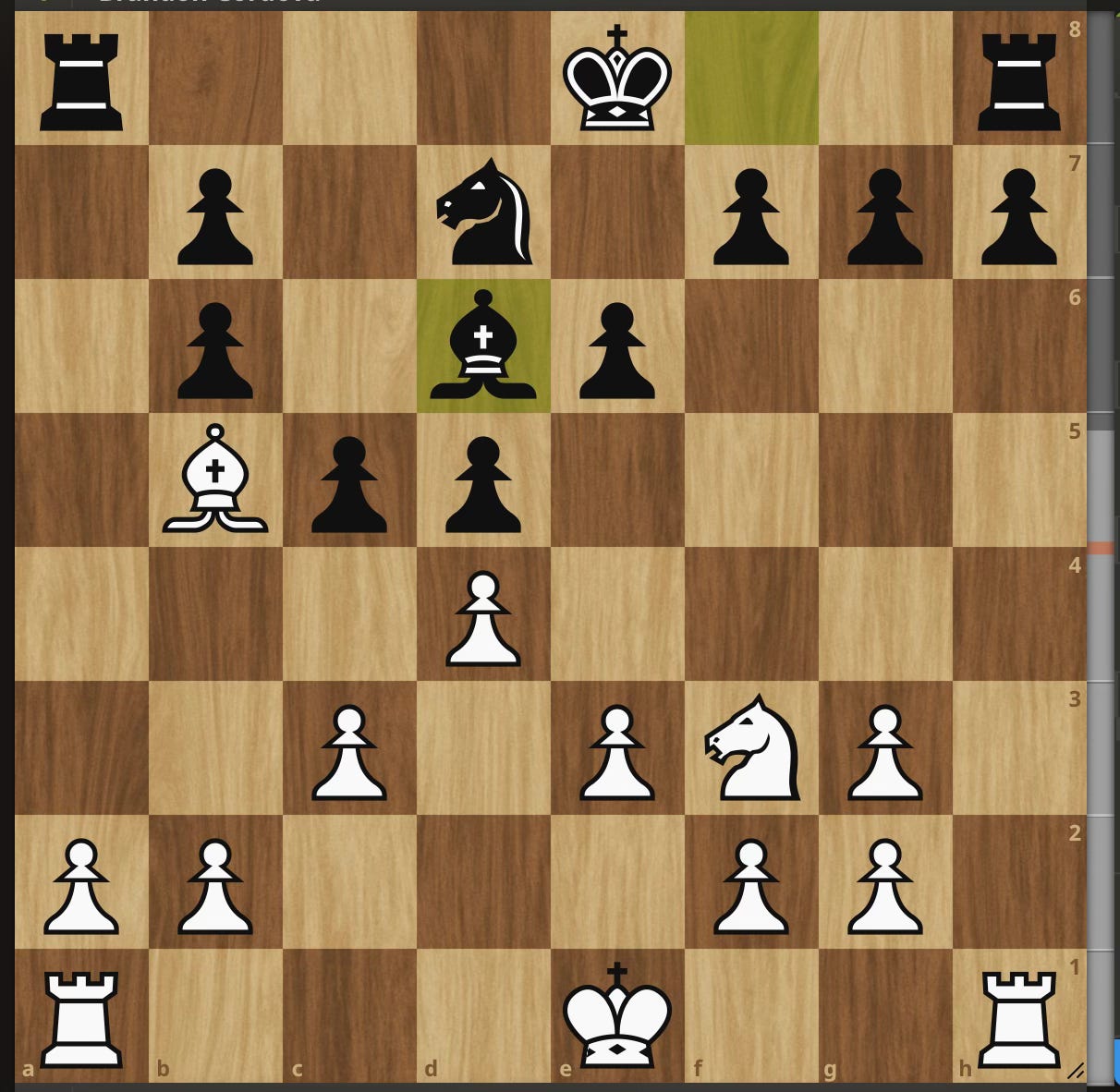 The Evaluation Bar shows White is ahead, but I didn’t realize it. I played Ne5?? and the evaluation went back to even. I missed Ng5! which turns the King into an overloaded defender. If Black plays Rf8 then Nxh7 wins a pawn. If instead Black plays O-O-O then Nxf7 forks the rooks. Ke7 is best but it allows the forcing line Bxd7 Kxd7 Nxf7 winning a pawn. I never saw Ng5 as an option. Only by testing out candidate moves did I find it.
