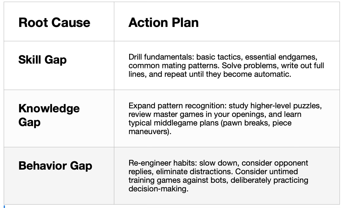 Drawing from my experience as a physician, I see parallels: we master medical knowledge, then practice, constantly learning from painful errors. Chess improvement follows the same pattern—identify the root cause, then apply the appropriate “treatment”.