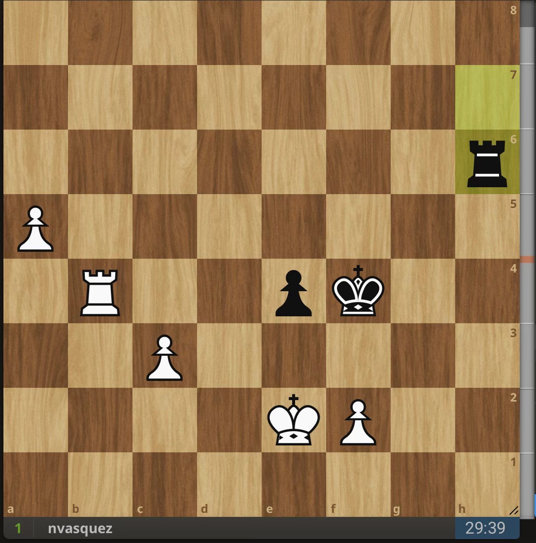 It’s an endgame and White is winning. One simple move secures the win for White. However, I didn’t really know the theory and played Rb6? instead. Endgame theory says that “rooks belong behind pawns” meaning Ra4 was the best move here. This was one of many endgame positions that I had mistakes in.