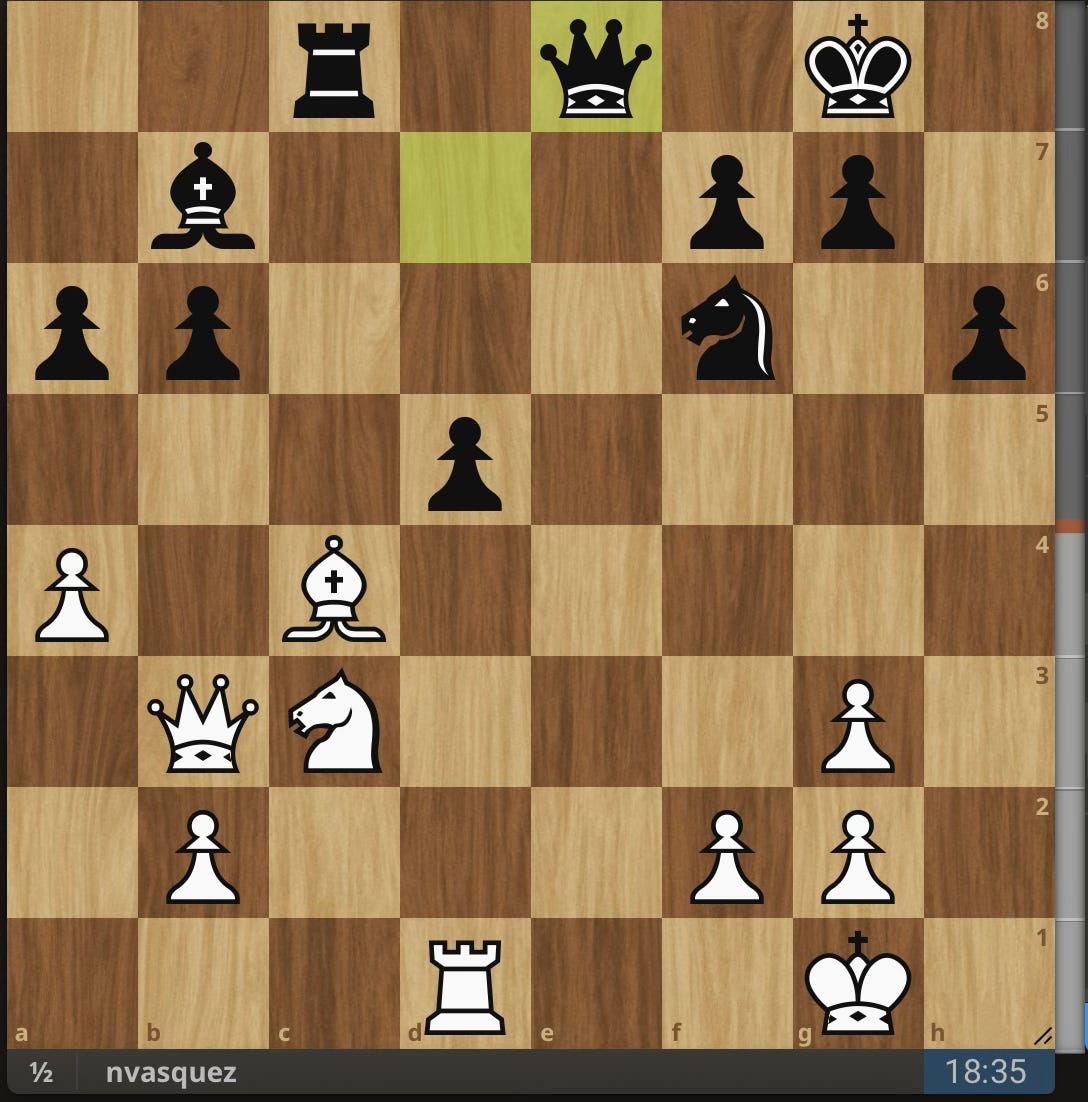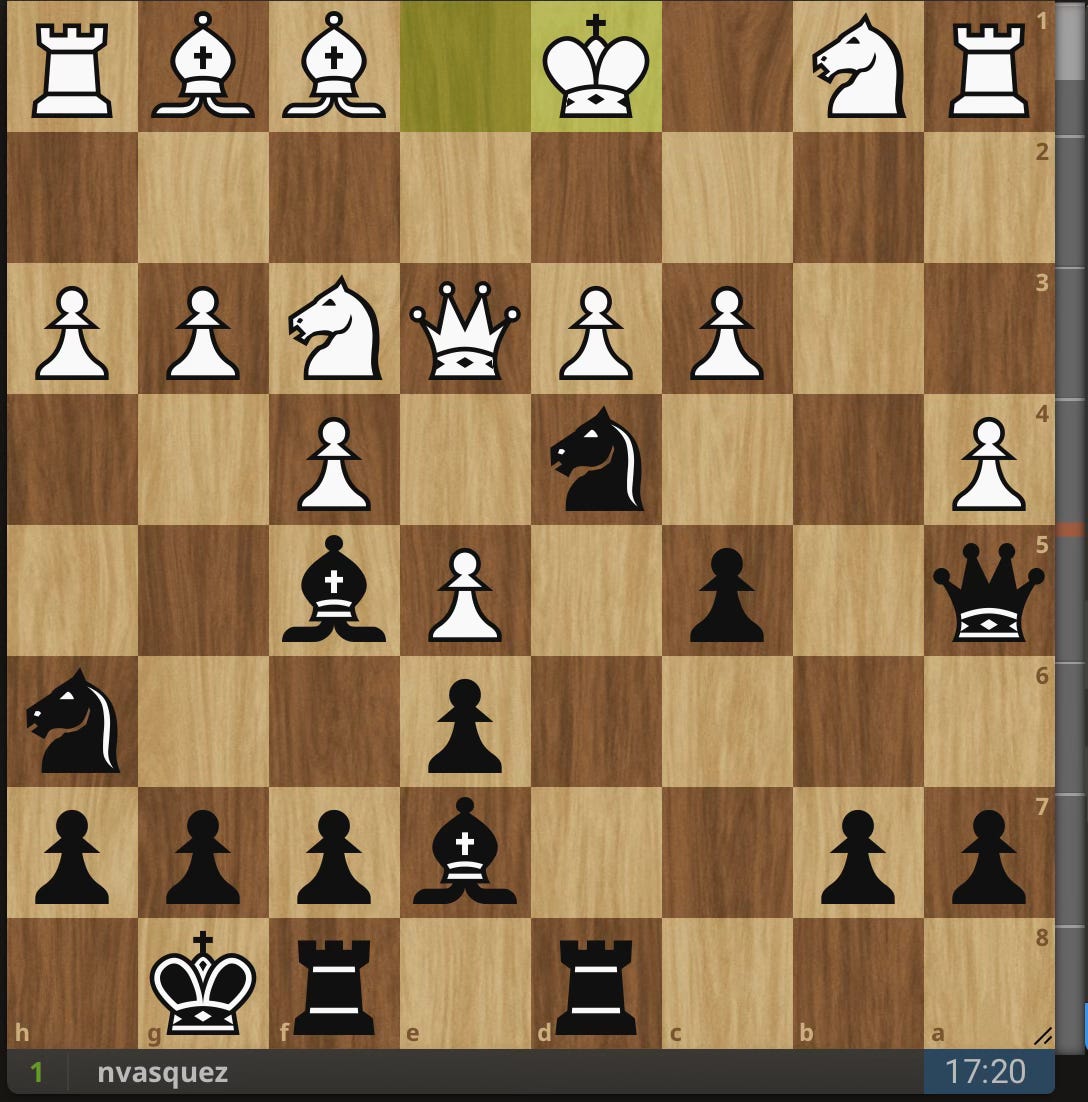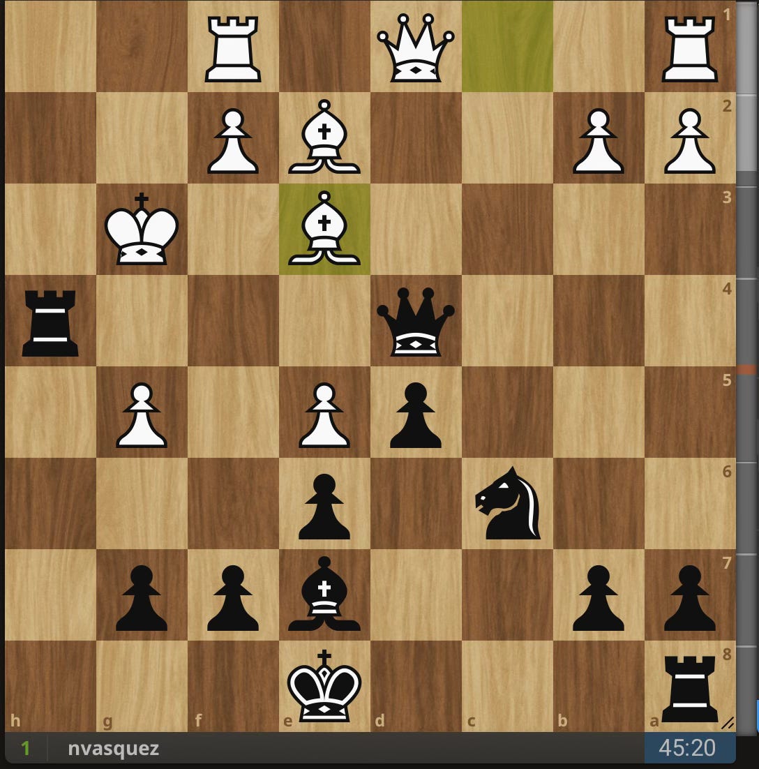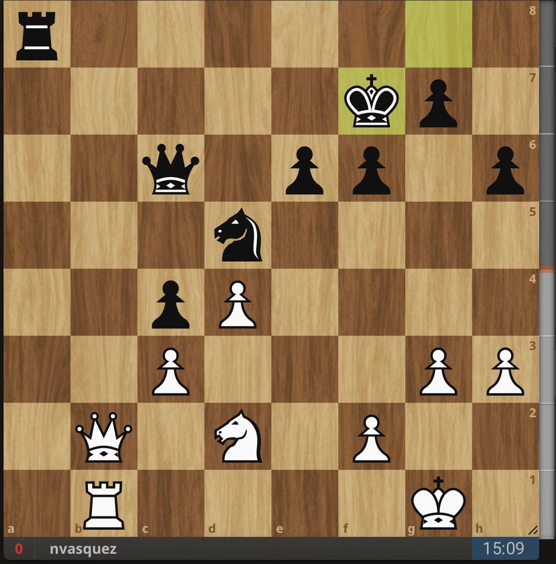 Here’ Black is winning and has a simple reply. However, I played Qxd1? very quickly. What I missed was 1…Qxe5+! is a trap for White. If 2.Kxh4?? then Qh2+! Kg4 Ne5#. I missed it because I played my move so fast I added 30 seconds to my clock in a 45+45 game. Yikes.