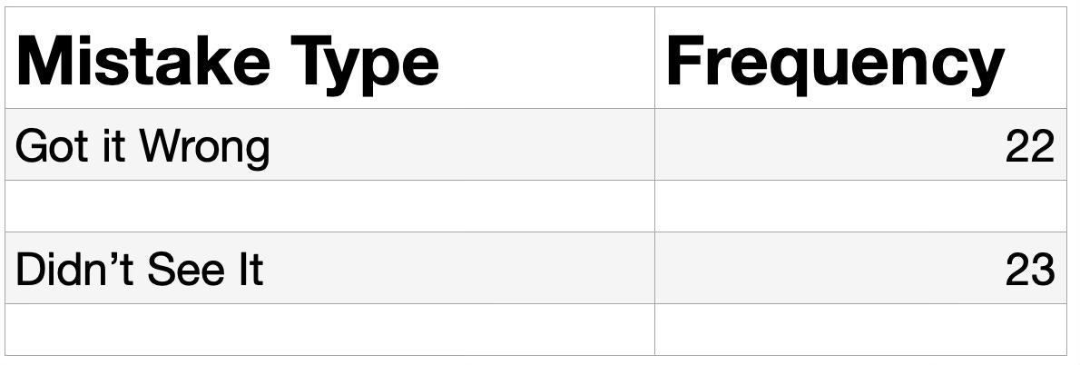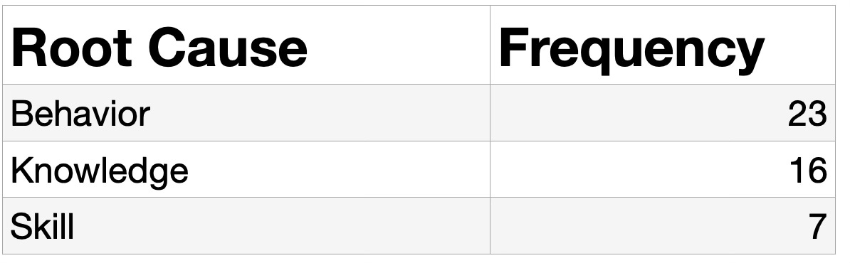 There is an even distribution between the two. I’ve had just as many mistakes occur when I saw something in the position as I did when I was blind to it. Also, the rate of serious mistakes I make is about 2.25/game. Perhaps not too surprising given my rating level. The issue however is that it’s not at all clear what I should do to reduce that mistake rate. To find that we need to look at the root causes: Skill, Knowledge, and Behavior