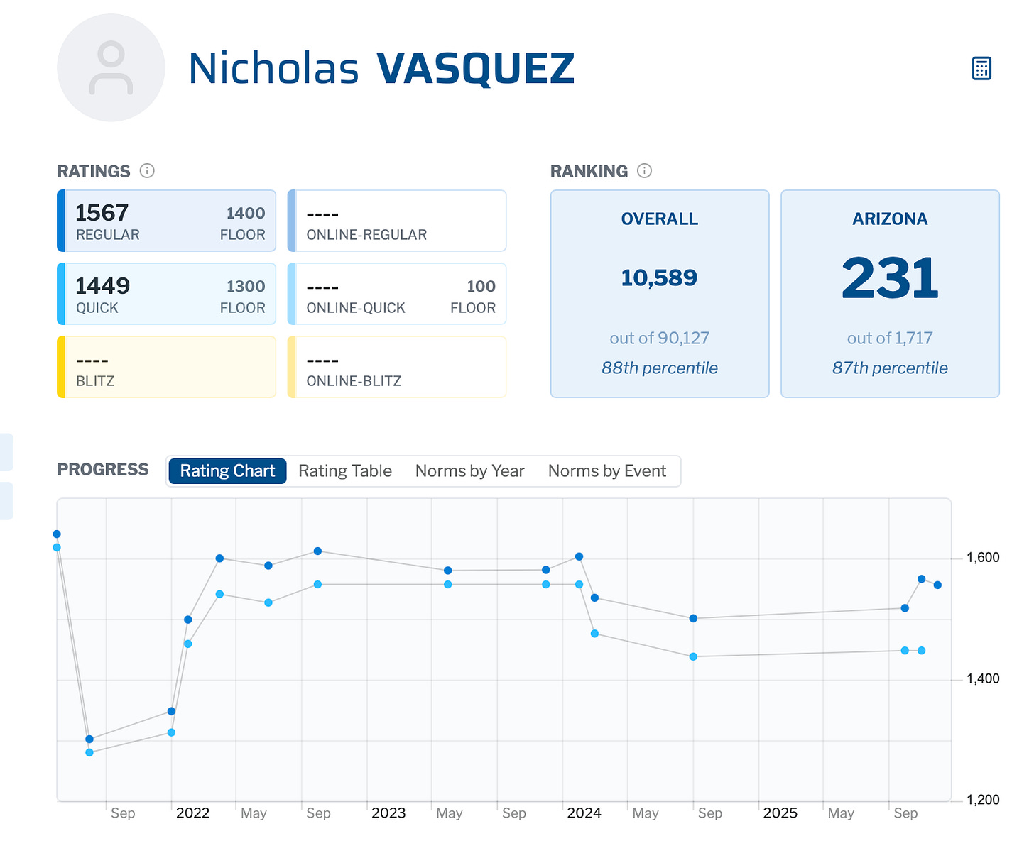 Again, this looks like movement around a mean. However I was surprised to find I sit in the 87th percentile for Arizona. At least I’m consistent in my relative capabilities both online and OTB. (As an aside, props to USCF for their new Ratings page. Very cool.)
