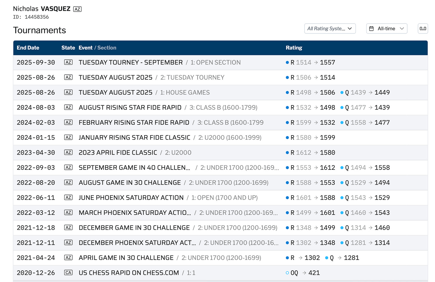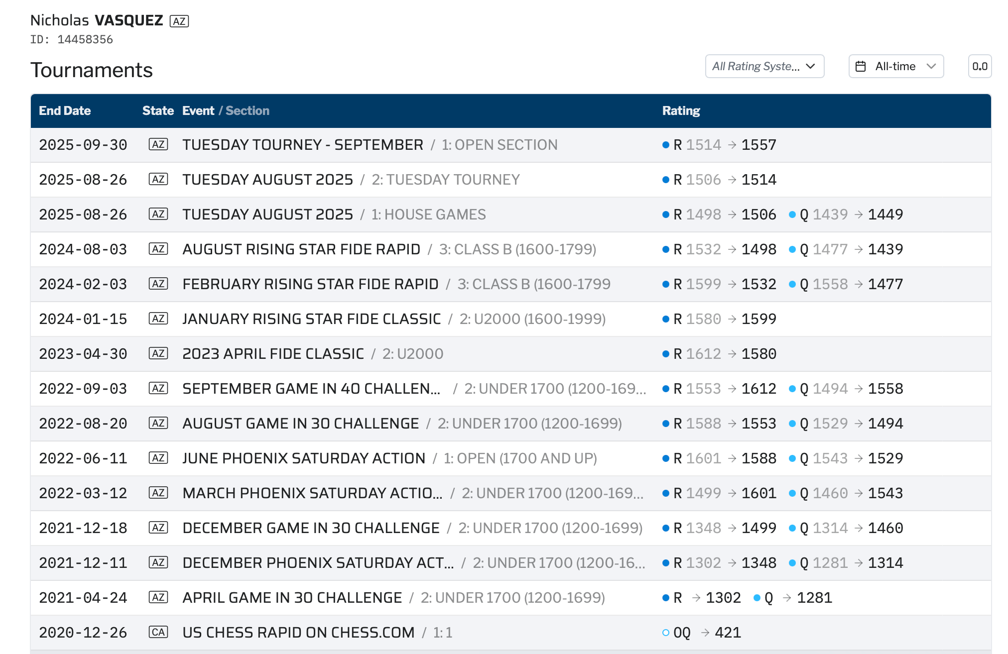 There was a flurry of activity in 2022, but then only one tournament in 2023. I had 3 tournaments in 2024 and again in 2025. This is a total of 47 rated OTB games in my career since 2020. The honest truth is that’s not nearly enough to learn and grow as a chess player The other honest truth is the 182 online classical games I’ve played since 2021 are helpful, but OTB is a more intense learning experience than online IMHO.