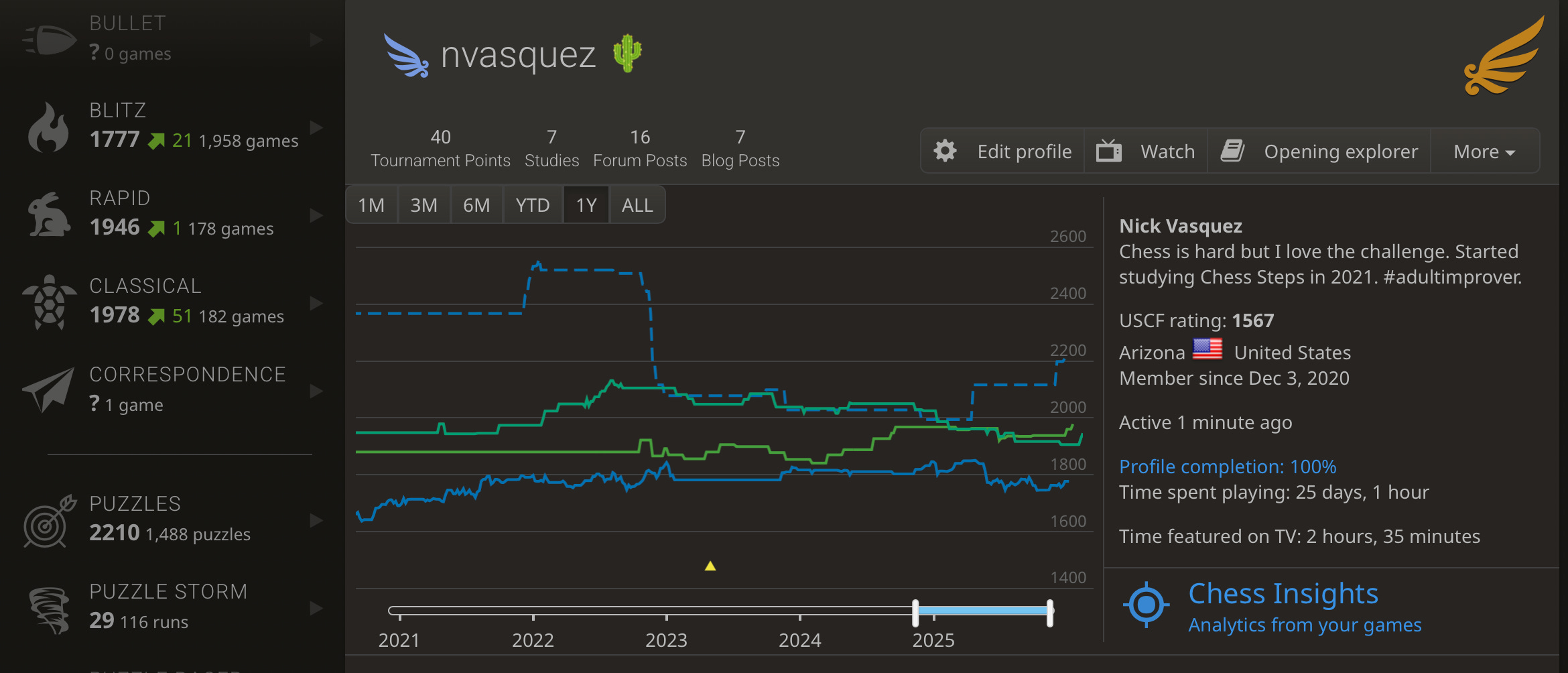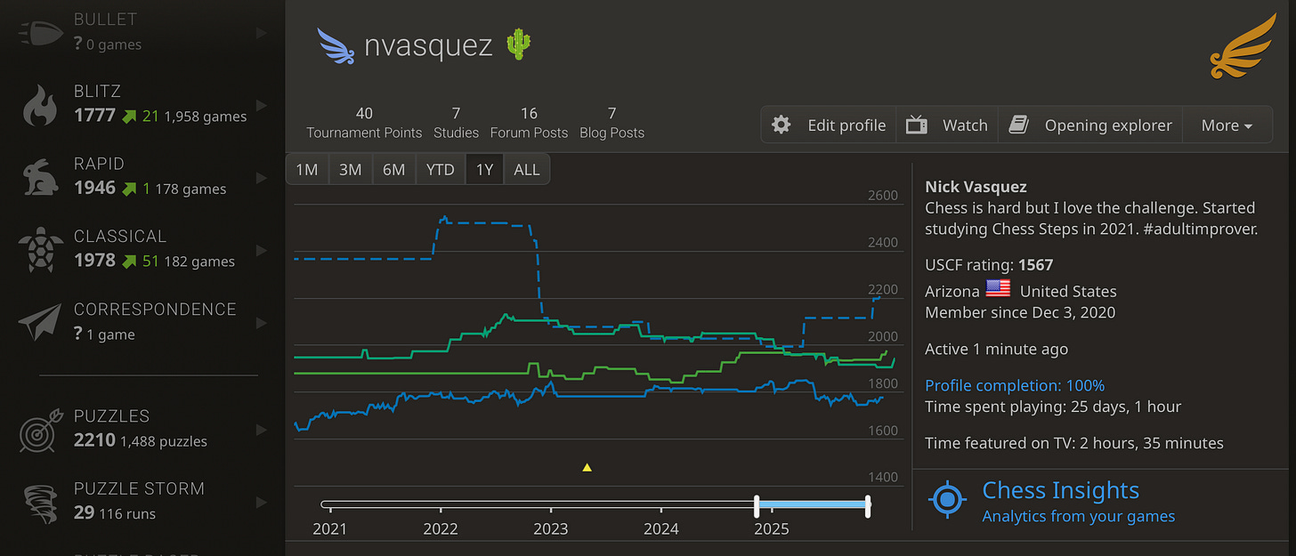 Before I get into any plans for world domination (or at least Arizona) let’s be real for a moment. I am a (currently) 53 year old adult improver who has been at this since 2021. Here’s my Lichess rating graph over the last year.